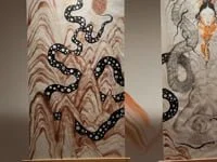 Sumi ink, blood, mulberry paper, gouache, acrylic, wood.